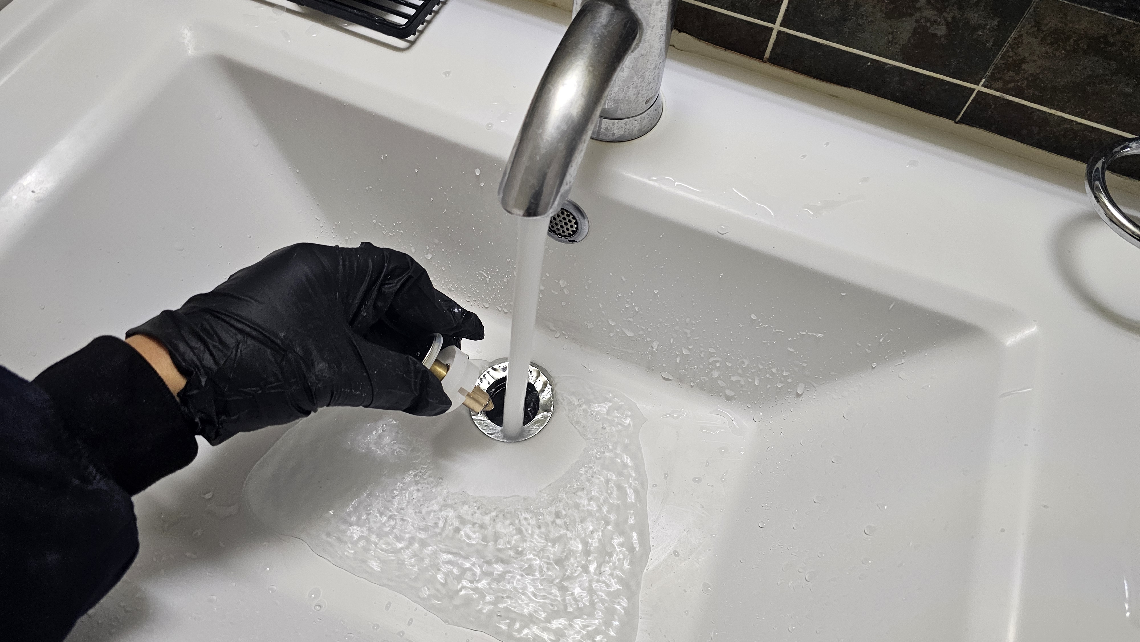세면대 팝업과 트랩을 연결하고 물을 틀어서 누수가 있는지, 배수는 잘 되는지 확인합니다.